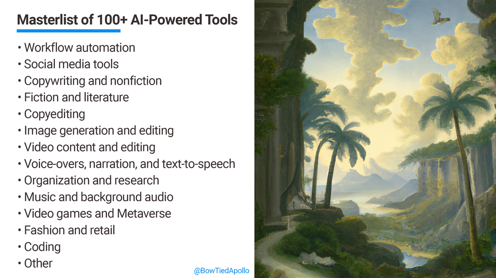 After I began working with AI art, I discovered other tools over time. It's a rapidly-evolving space and new tools are constantly popping up. I've compiled a list of more than 100 different resources. Links and short descriptions included for each.